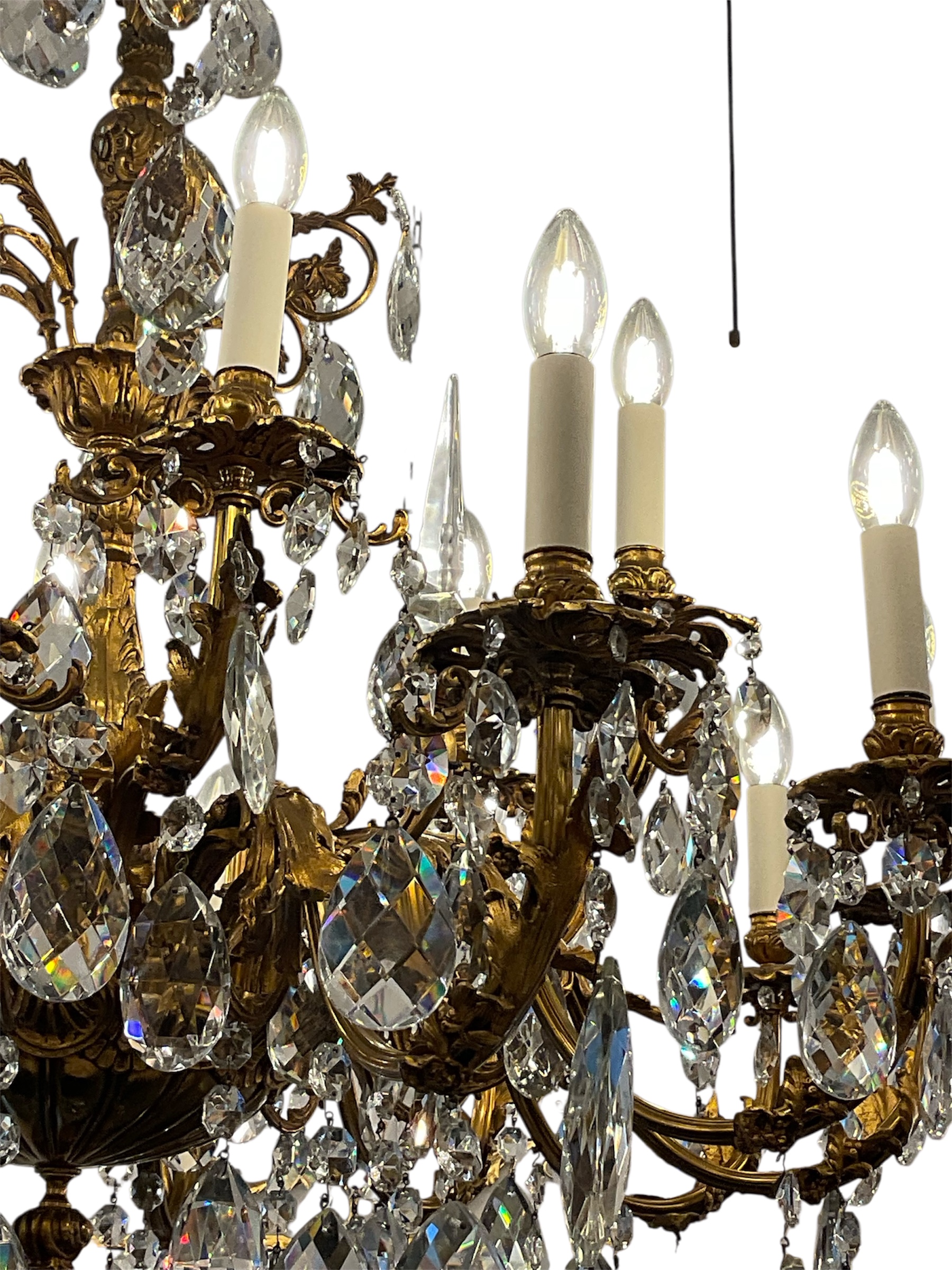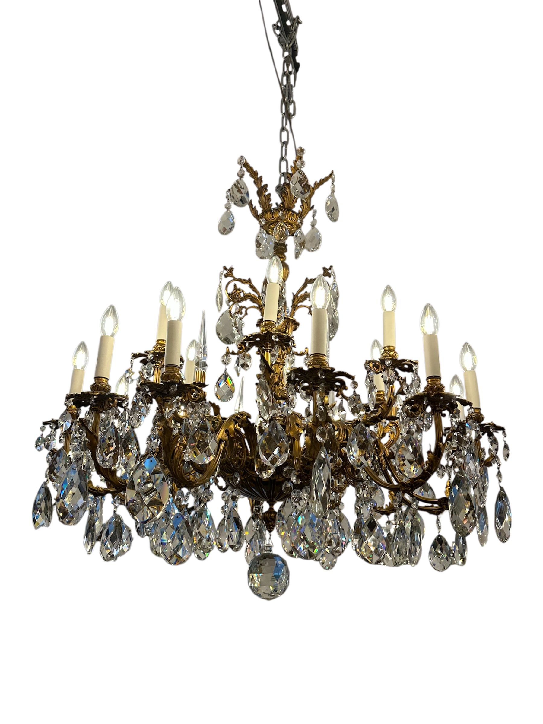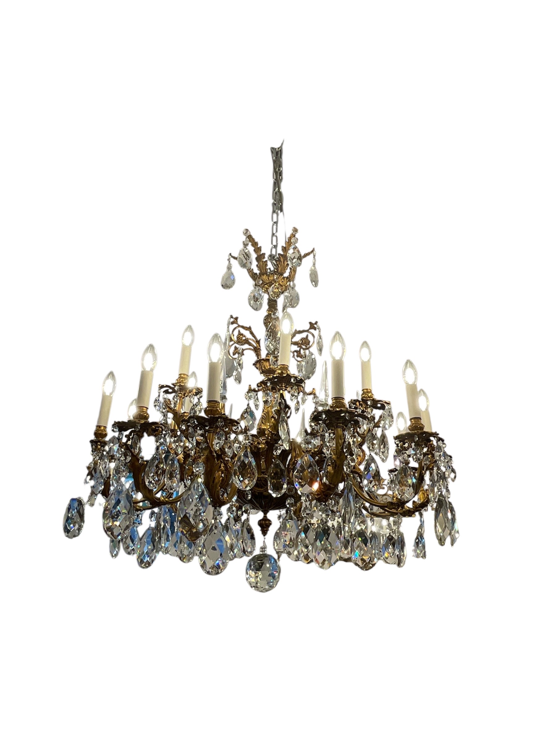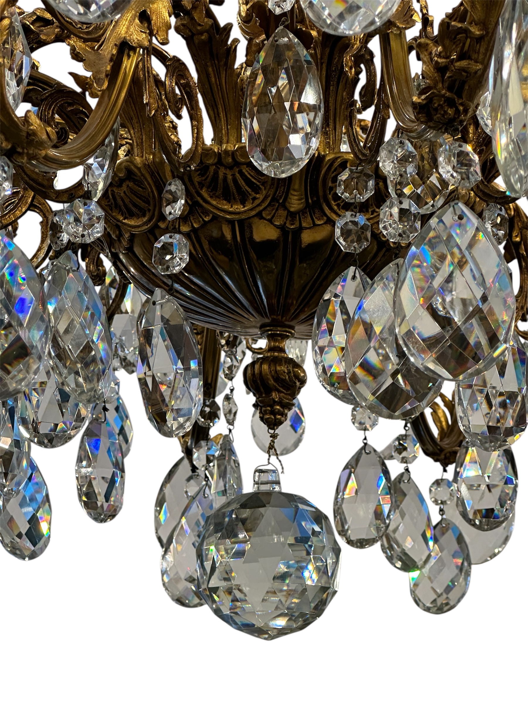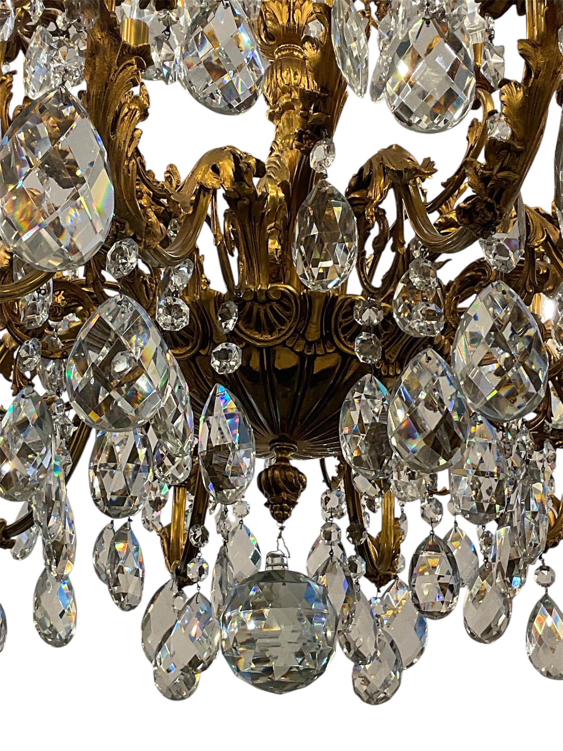 The frame is composed of heavy cast Bronze with a rich authentic Ormolu finish with Acanthus leaf motifs with large pear shape Crystal drops and a large faceted basal ball.