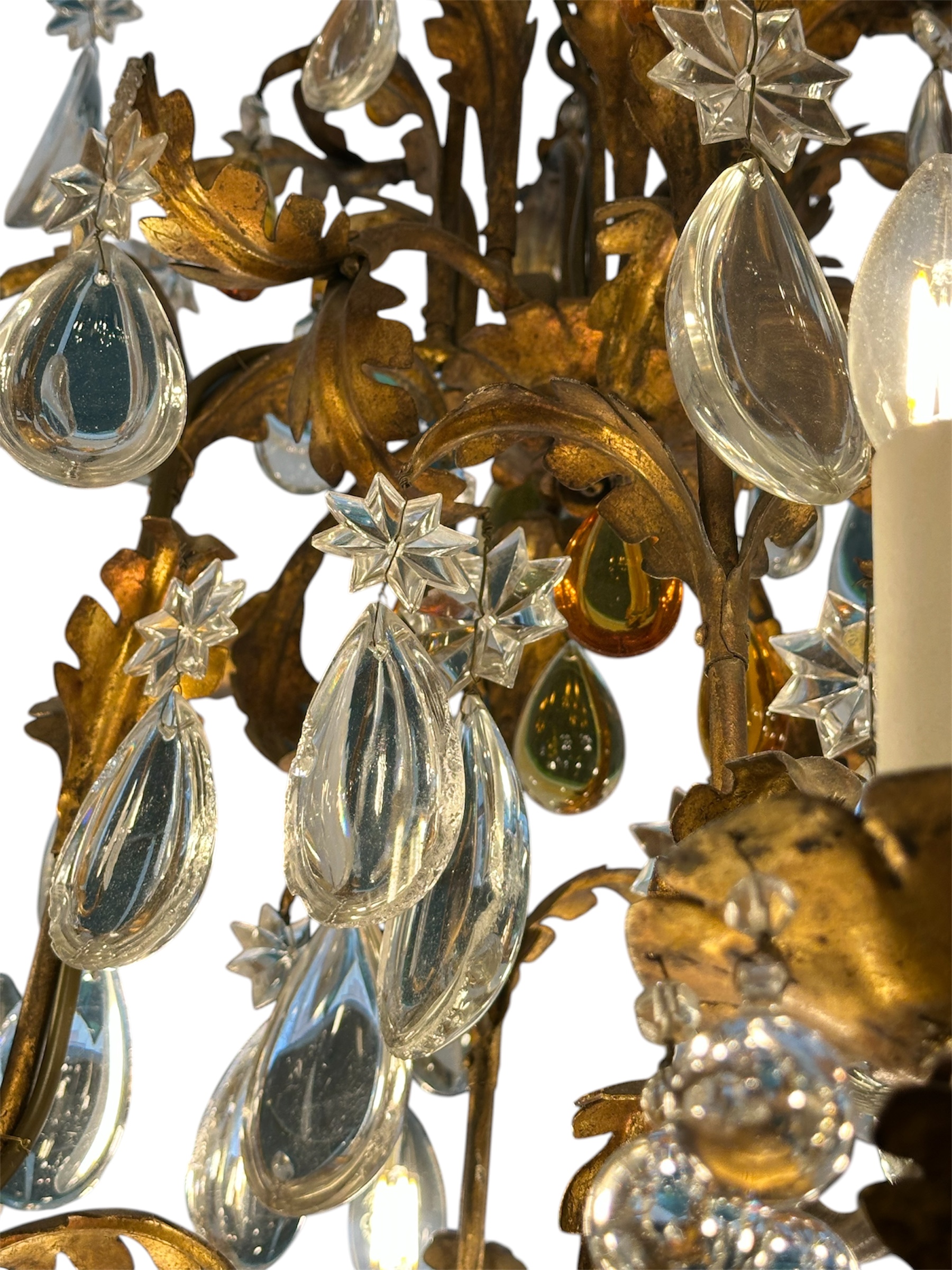 French 1940’s “Foliage and Flowers” Lead Crystal drops Maison Bagues chandelier with Amber and clear drops and Murano Crystal drops very good quality