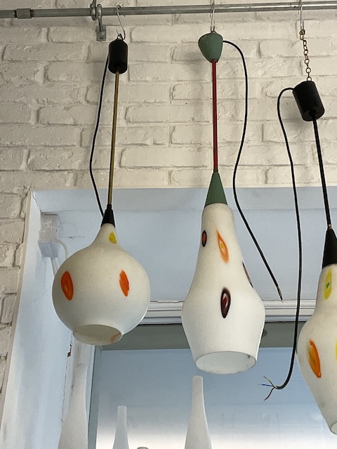 Italian set of four 1945-50’s opal glass with Murrine pending lights attributed to Ercole Barovier