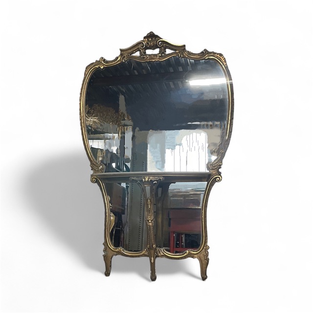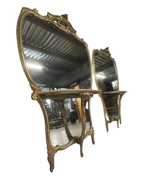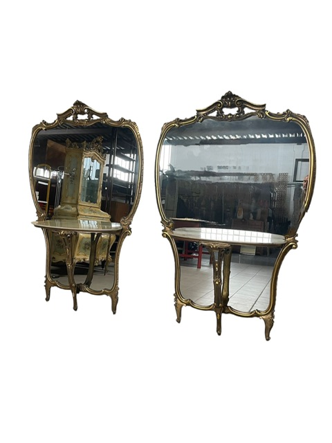 Italian pair of 1930’s Venetian gold leaf and marble top large console mirrors